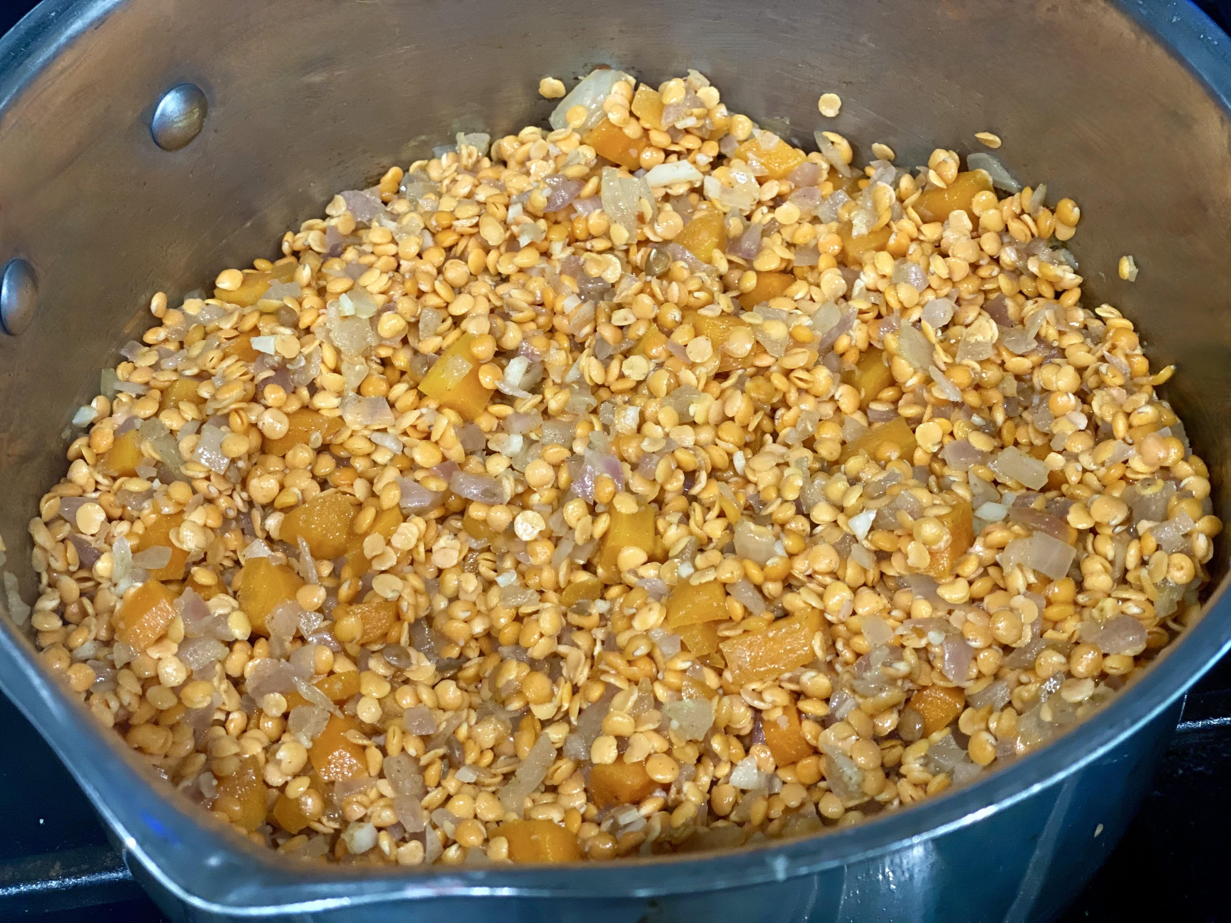 - Now its time to add the rinsed lentils and spices. Cook for 3-4 minutes stirring, season with salt/pepper, then add broth.