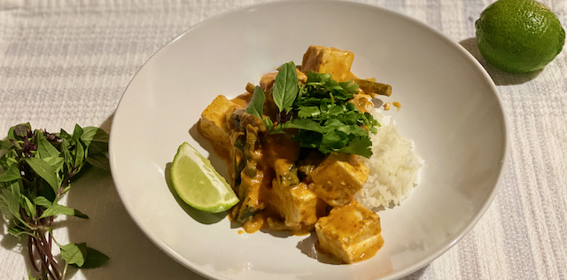 - While the curry is simmering, cut the tofu into cubes and add to the mix along with the vegetables seared earlier.