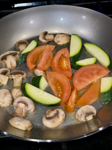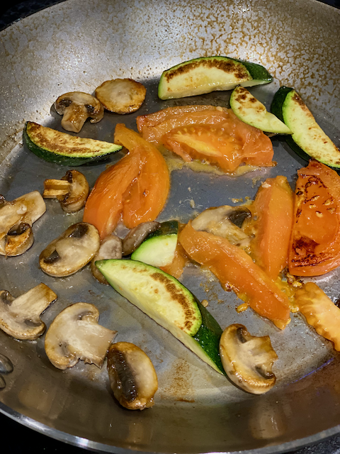 - Using a searing pan, bring 1 tbsp oil to medium-high. Place mushrooms, zucchini and tomato in pan and season with salt. Lightly sear, about 2 minutes then flip to sear other side and salt again. Remove veggies from pan.