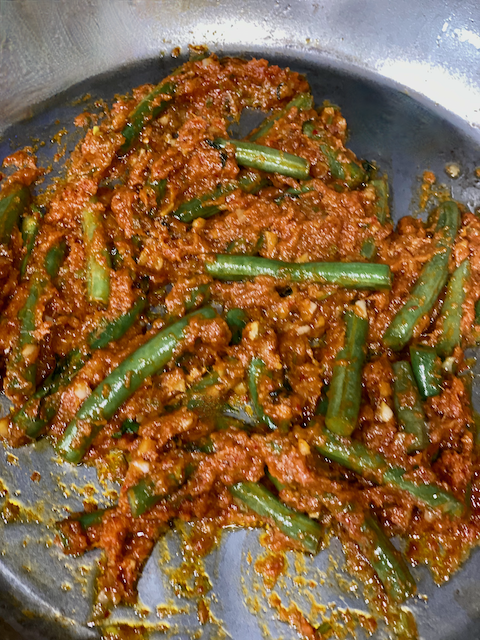 - Add other tbsp oil to pan and heat to low-med. Add garlic, cilantro stems, ginger and green beans. Cook, stirring frequently about 5-7 minutes. Add red curry paste and cook another 2-5 minutes. Next add coconut milk, lime zest and juice and salt. Throw in about half of the basil and cook 5-10 minutes, stirring occasionally.