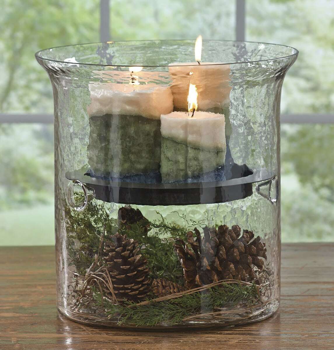 Transform any space into a cozy seasonal retreat with our Hammered Glass Cylinder with Three Pillar Candle Holder. This striking centerpiece blends natural charm with timeless elegance: