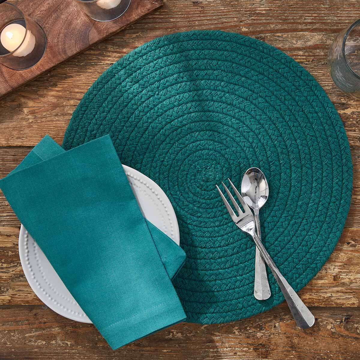 Add a splash of vibrant color to your table setting with the Split P Peacock Placemats. This set of 4 round placemats features a stunning peacock green-blue hue and a beautifully braided design that brings a fresh, lively look to any meal. The rich color and intricate texture provide the perfect combination of elegance and functionality, making these placemats an ideal addition to your home décor.